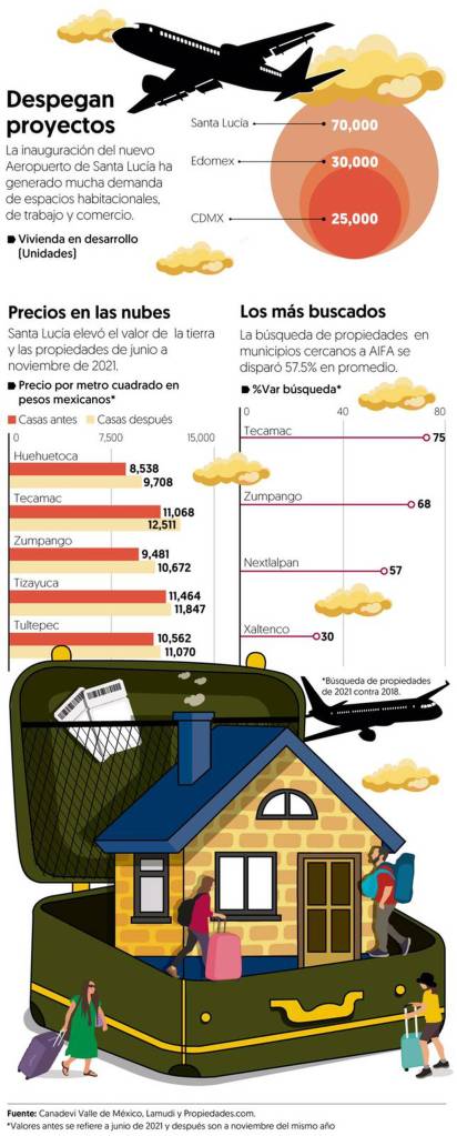 La inauguración el próximo 21 de marzo del Aeropuerto Internacional Felipe Ángeles (AIFA), mejor conocido como Santa Lucía, levantó el interés de las familias por buscar vivienda económica cercana al proyecto insignia de la actual administración, por lo que desarrolladores proyectan edificar más de 70 mil viviendas en los municipios aledaños de la obra.